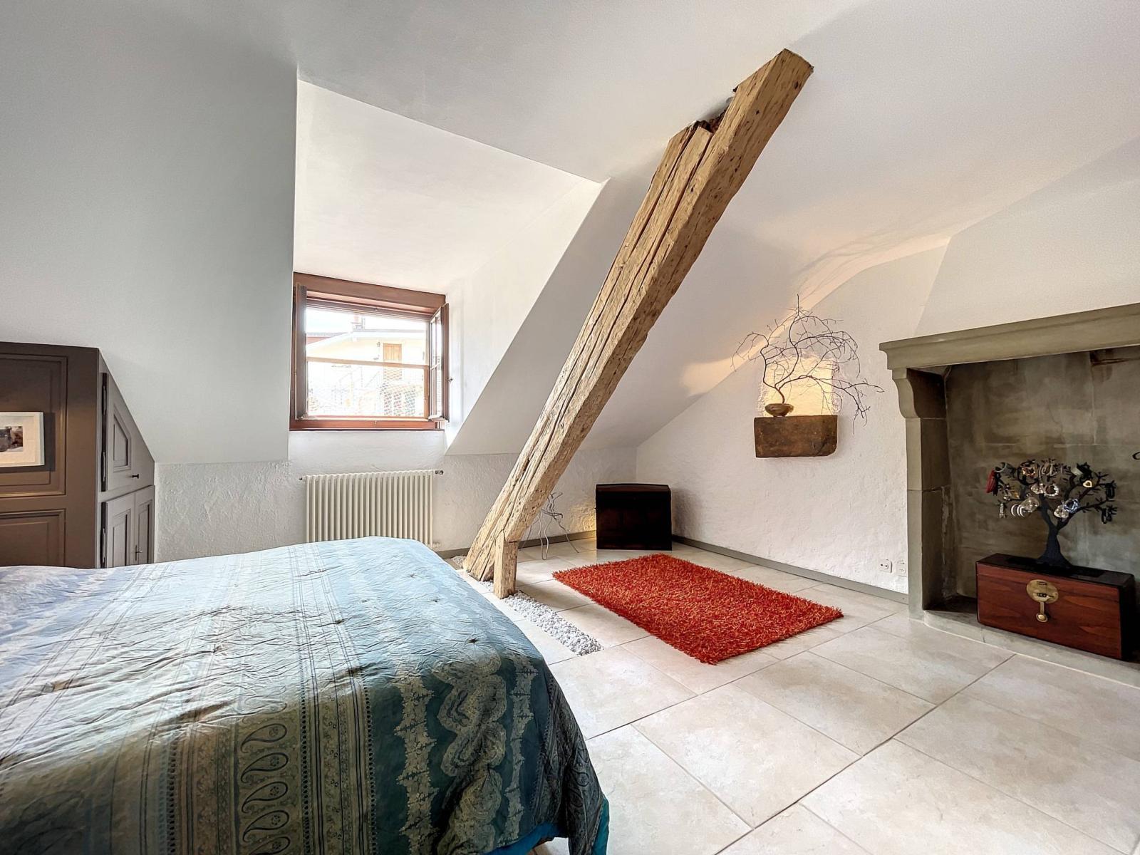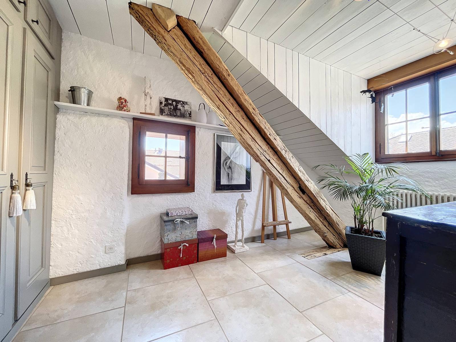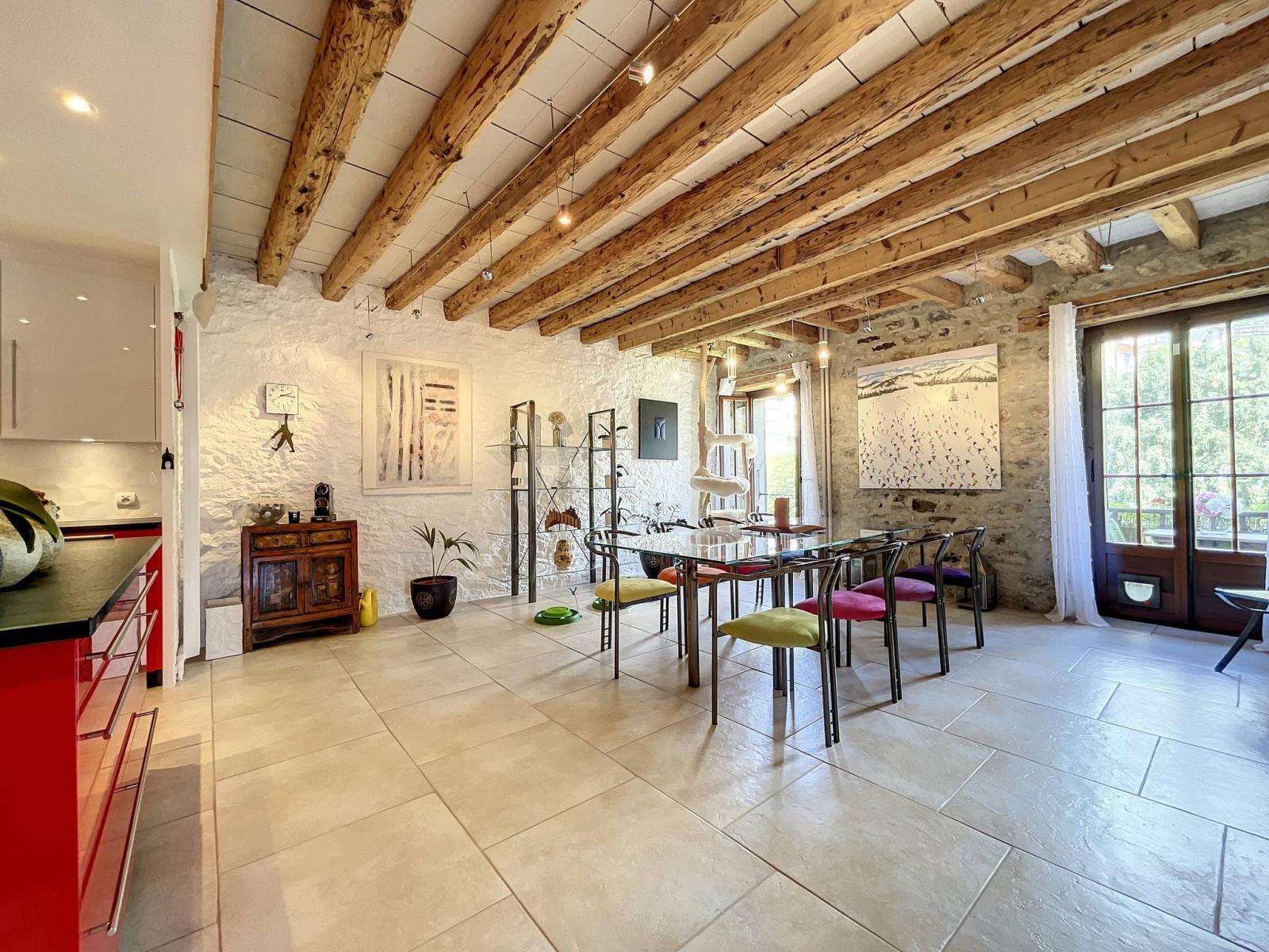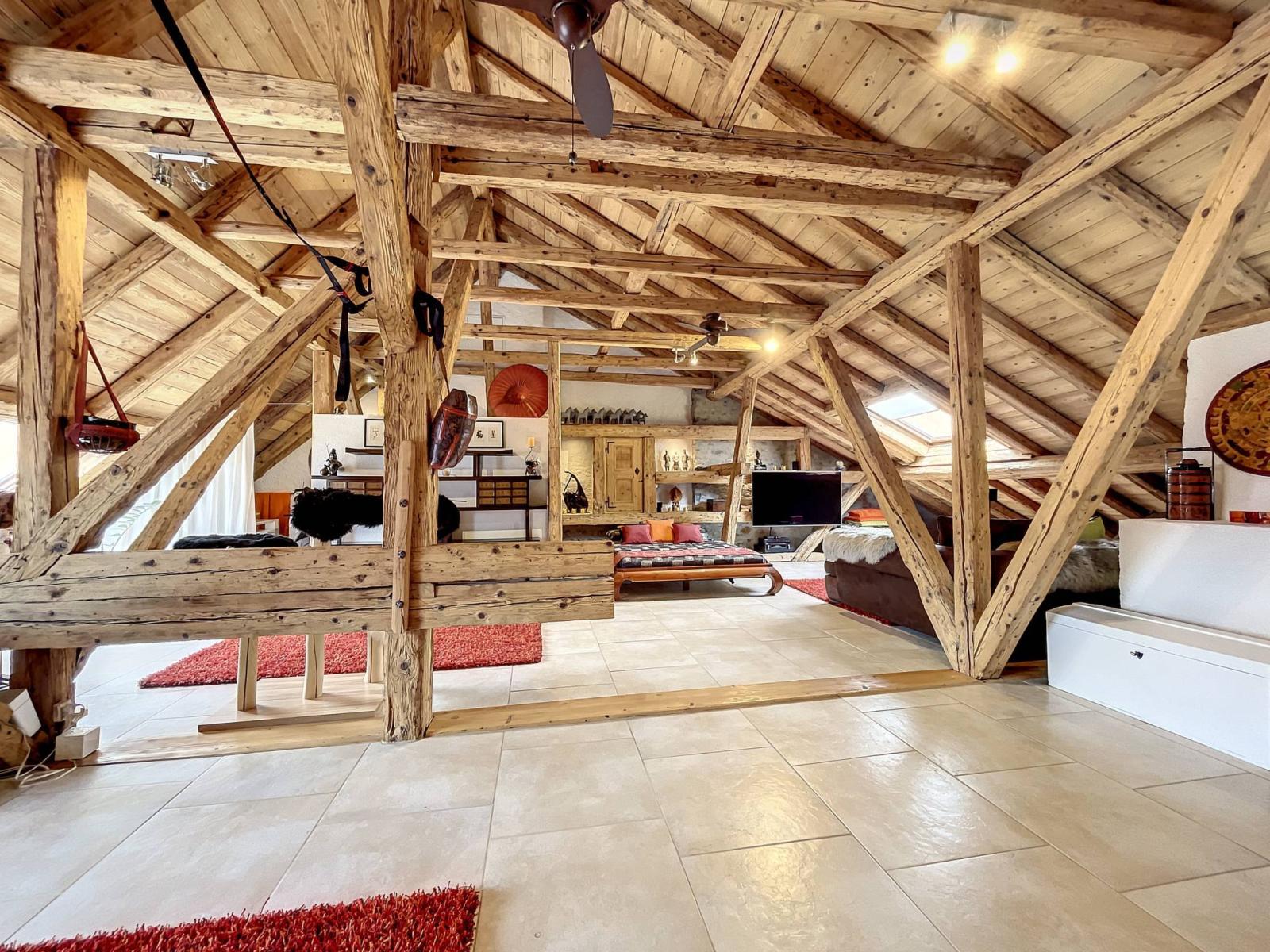 Es verfügt über Steinwände, freiliegende Balken und eine hohe Decke, die der Wohnung ihren ganzen Charme verleihen.