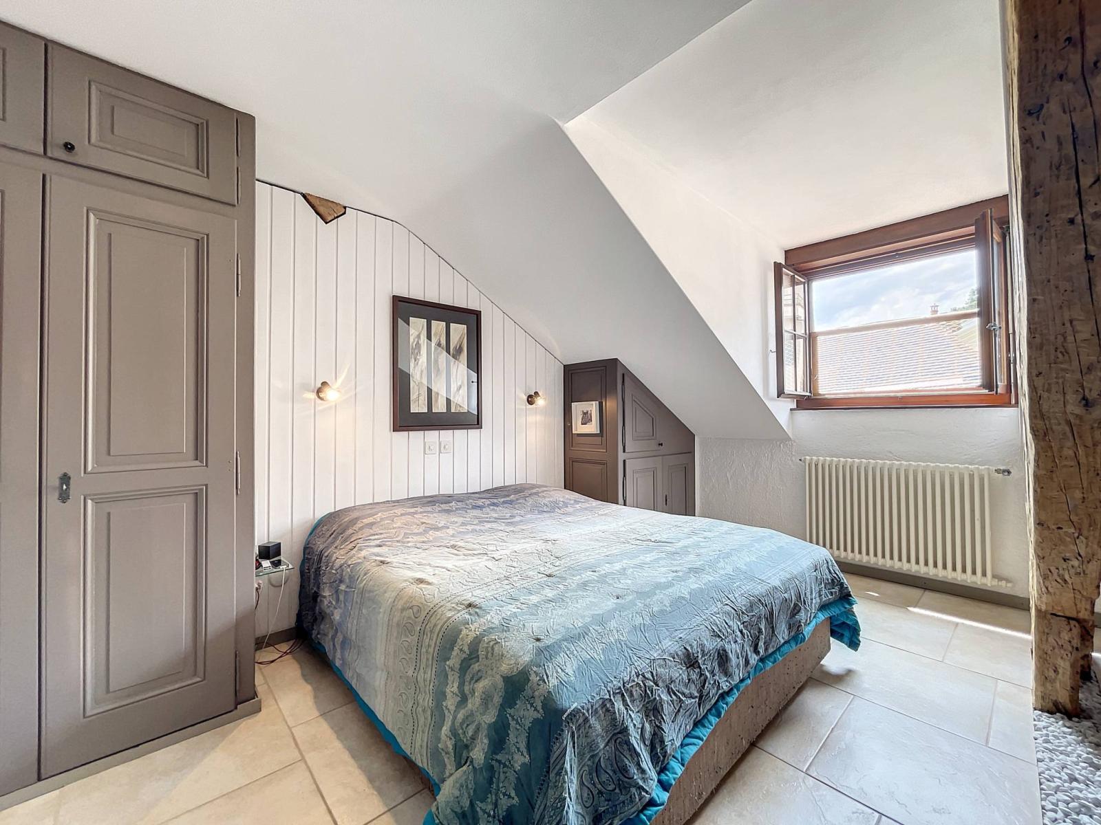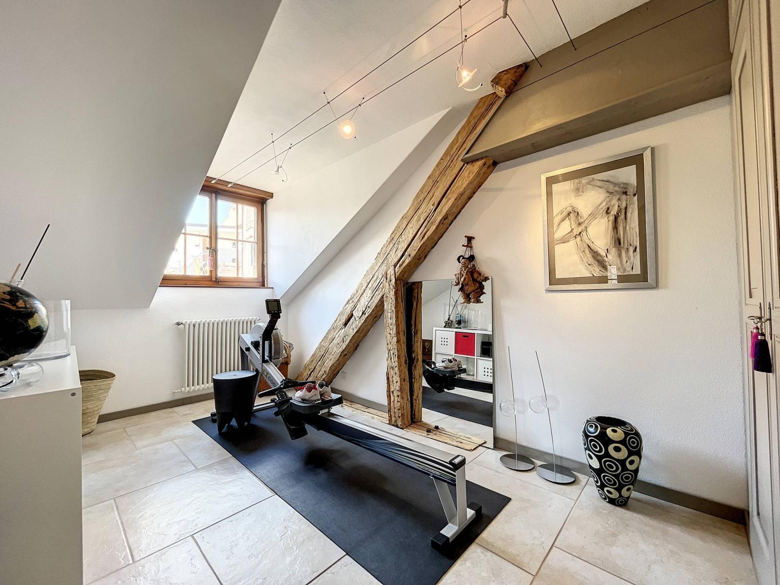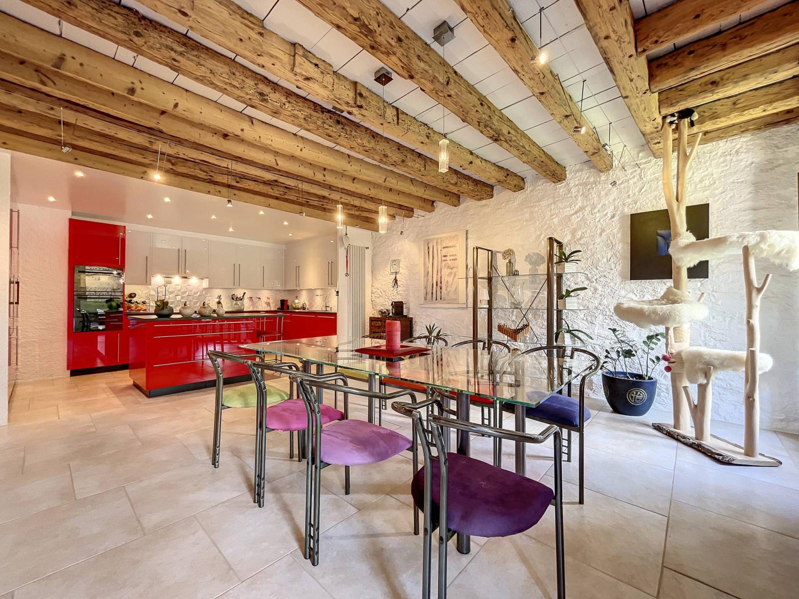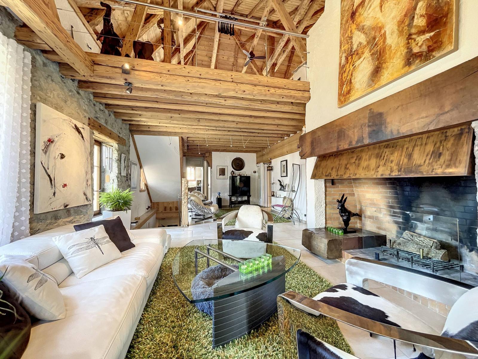Es verfügt über Steinwände, freiliegende Balken und eine hohe Decke, die der Wohnung ihren ganzen Charme verleihen.
