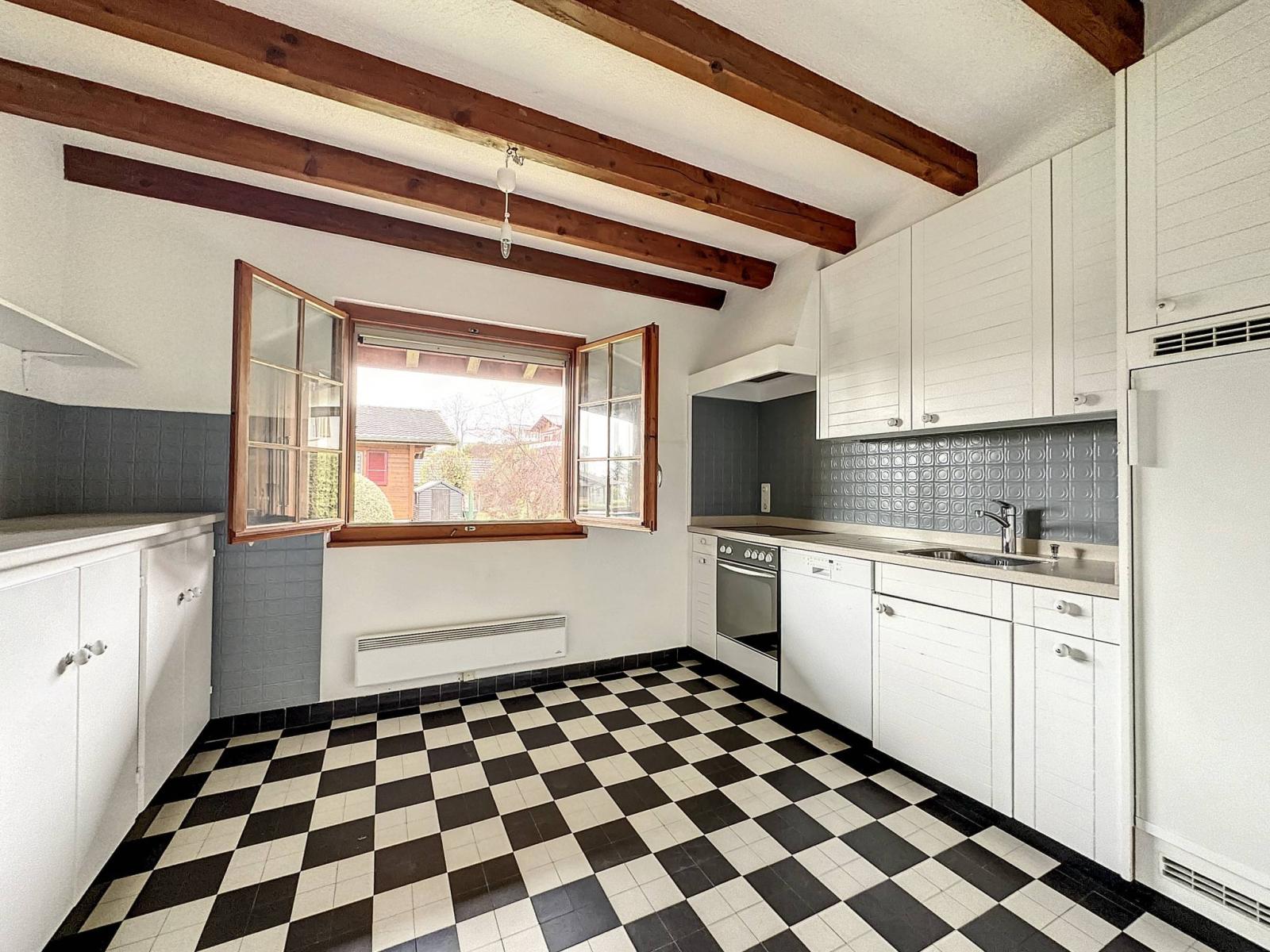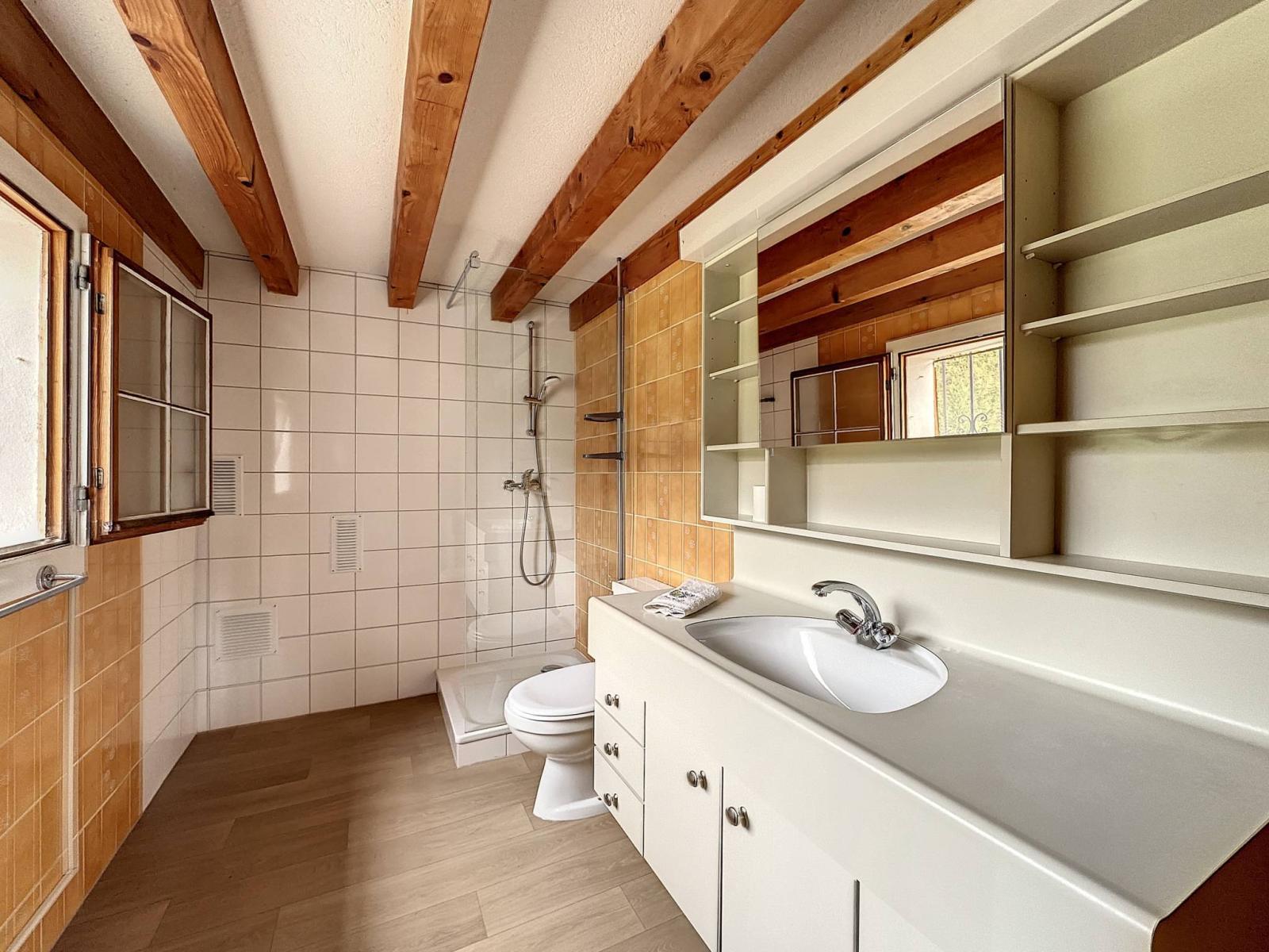 Das auf drei Ebenen mit umgekehrtem Grundriss erbaute Haus besteht im ersten Stock aus einem hübschen Wohnzimmer mit seinem originalen Holzofen, der auf einen Südbalkon mit Aussicht führt, einer unabhängigen Küche, die zum Wohnzimmer hin geöffnet werden kann, zwei Schlafzimmer und ein Duschbad mit WC.