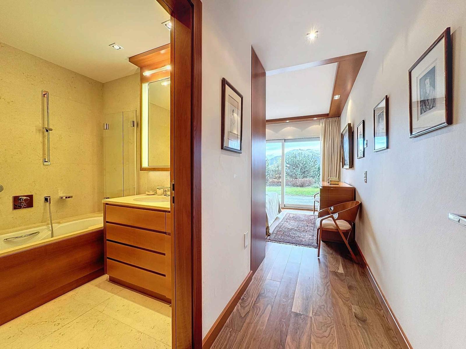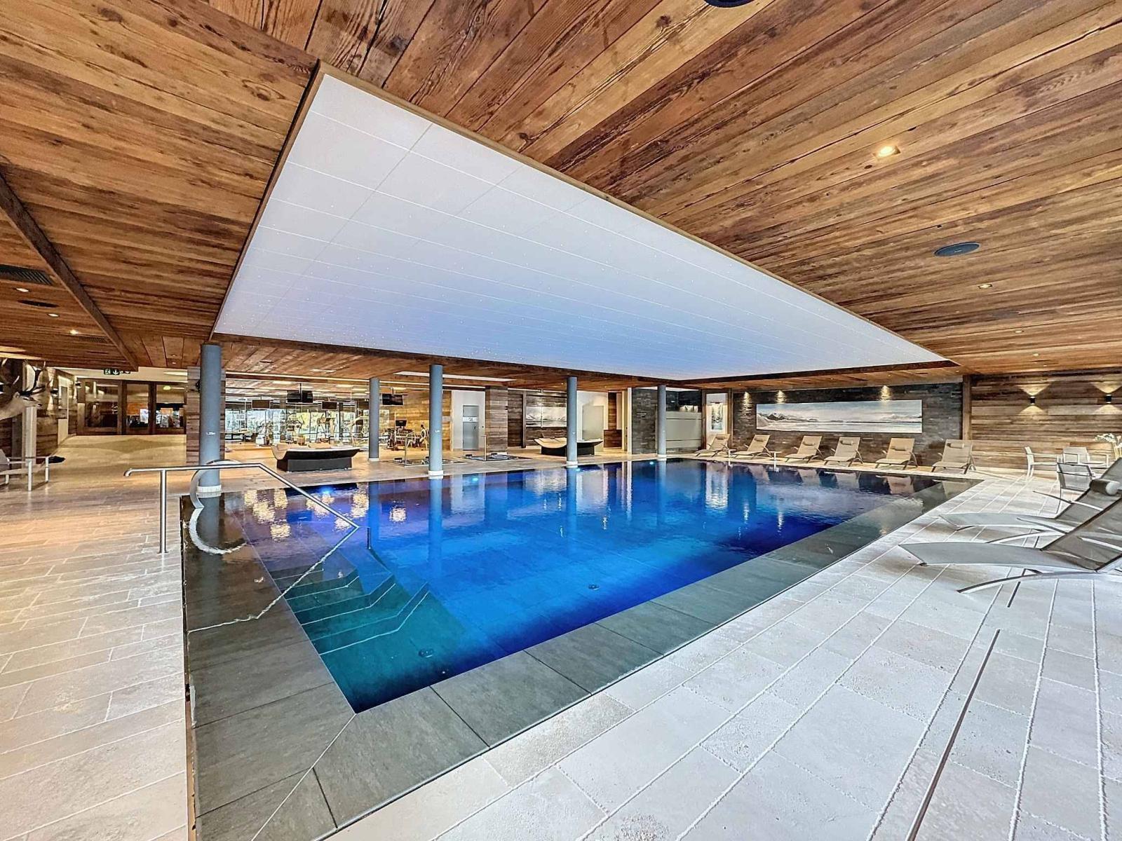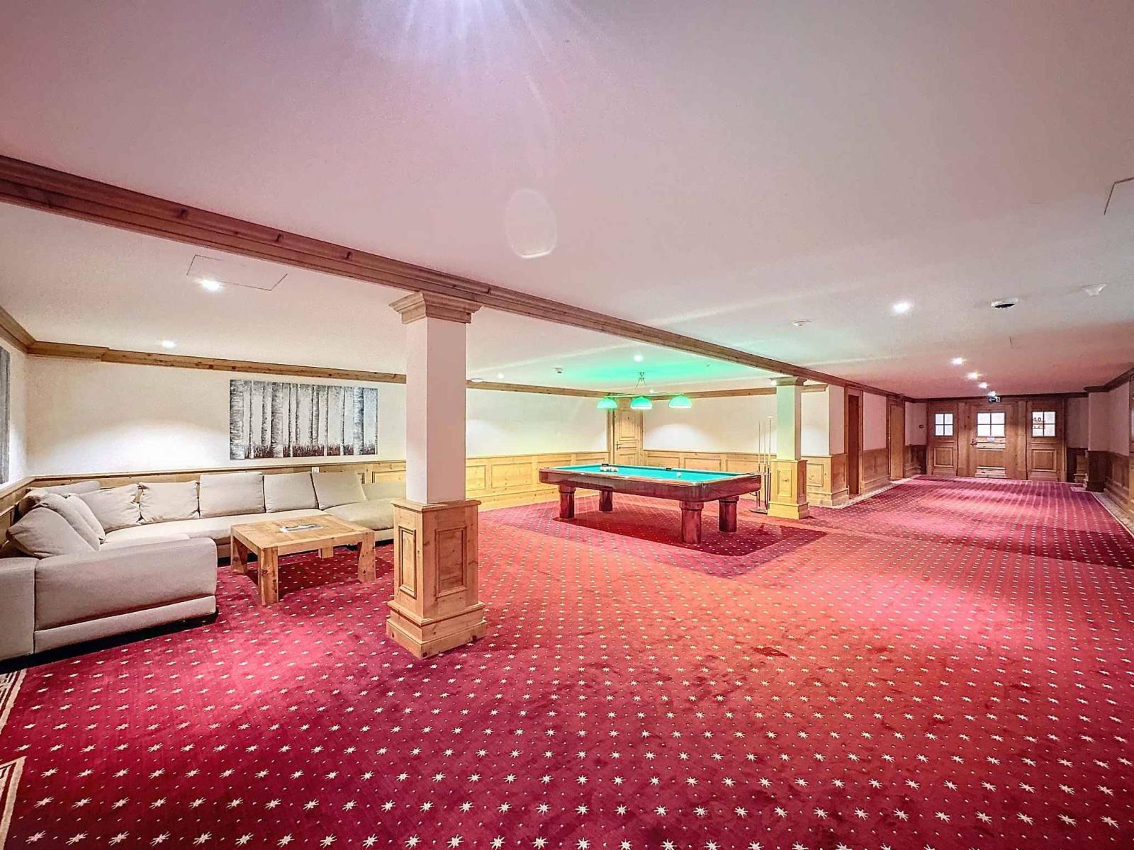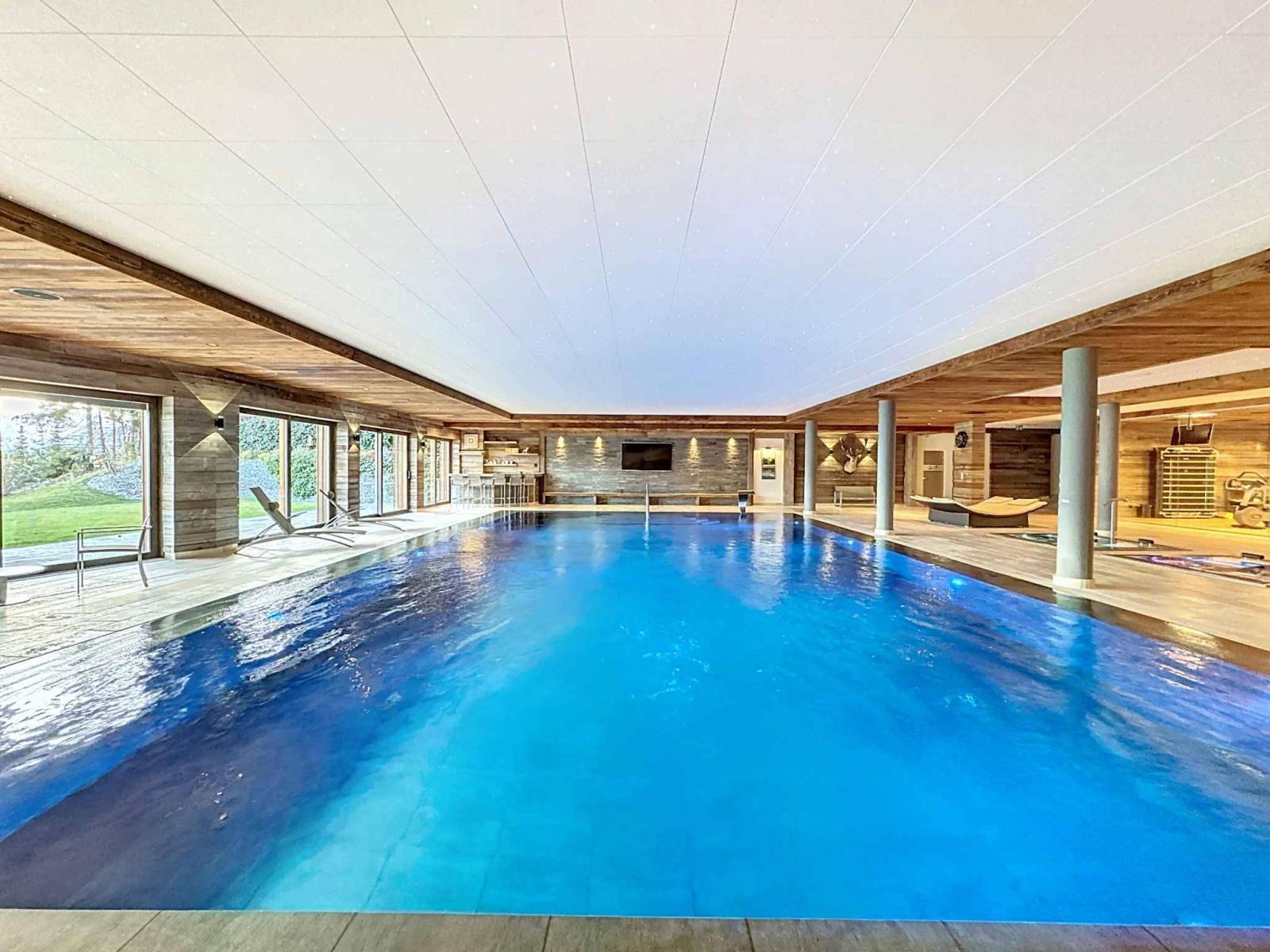 Die Residenz verfügt über einen herrlichen Innenpool mit Bar, Kamin, Entspannungsbereich, aber auch einen Fitnessraum, eine Sauna und ein Hamam, einen Massageraum sowie einen Billardbereich, einen Kinoraum, ein ausgestattetes Spielzimmer und ein prächtiges Carnotzet.