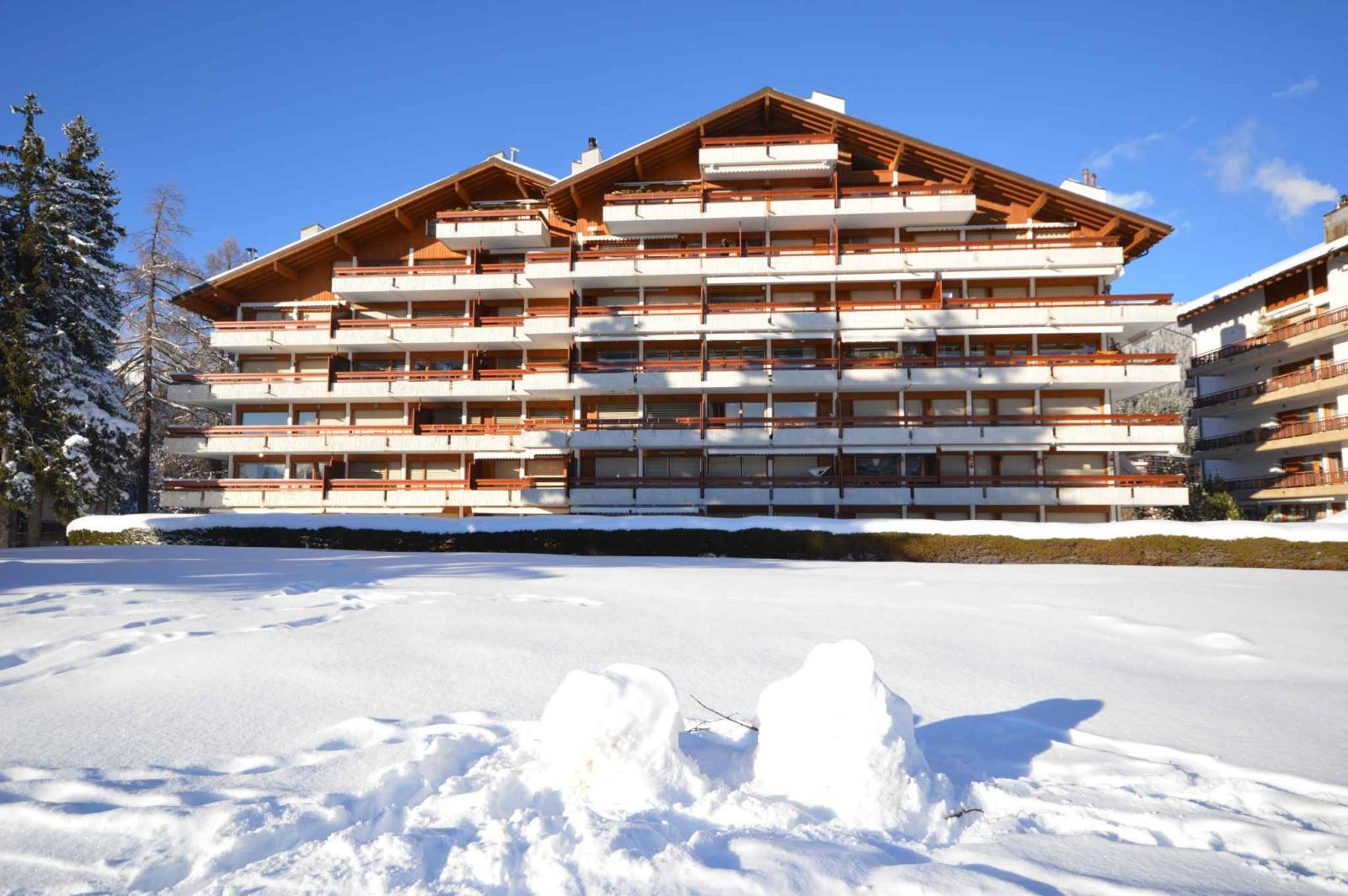 Nur einen Steinwurf vom Zentrum von Crans entfernt, gegenüber dem 18-Loch-Golfplatz Ballesteros gelegen, bietet dieses Apartment einen herrlichen Blick auf den Golfplatz und die Alpen.